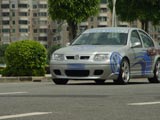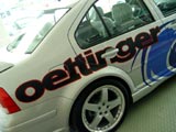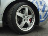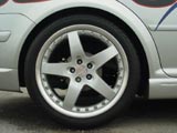 理所當然,作為OETTINGER國內代理的展示車,追求純種的配件當然很重要,但制動鮑魚、輪胎等無法替代的產品,只好妥協采用可靠的品牌。懸掛是OETTINGER的純種產品,前后懸掛均換成絞牙避震套件,黃色的絞牙避震藏在輪胎背部,由于降低車身高度的幅度較大,連拍照都存在一點困難。實路行走起來的路感跟普通街車沒有多大區別,倒是高速過彎的穩定性更好。