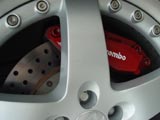 不少車主開始接受制動系統的改裝,制動系統對提升行車安全系數至關重要。而紅色鮑魚則為BREMBO的典型特征,就如紅色的法拉利一樣醒目。目前比較高端的鮑魚是對向6活塞的,該寶來1.8T230匹馬力選用了4活塞已能滿足需求。特別是前輪再匹配320mm鉆孔通風盤,制動能力再上一個數量級。大尺寸的制動盤除了帶來強烈的視覺沖擊外,最重要的作用是強化制動性能,縮短制動距離。通過加大制動盤的直徑,同樣剎車力度下的制動效果理論上應比原裝好許多,散熱效果也因為制動盤的面積增大而加強。由于摩擦生熱,利用摩擦將汽車的動能轉化成熱能,使汽車停止下來。那么,汽車越快,制動產生的熱量越大,對制動性能的影響也越大。因此散熱問題對制動效能非常重要。對向四活塞鮑魚則加大制動力矩,而且剎車皮與制動盤的所有接觸面上得到的壓力也更均勻。