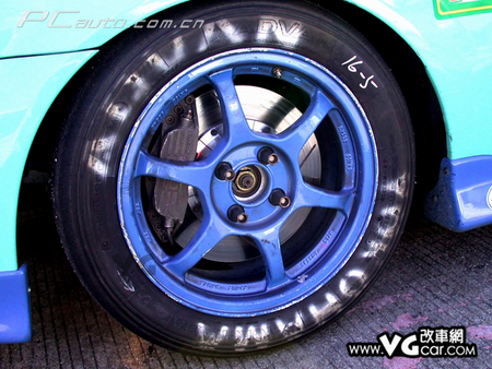 這臺323賽車的懸掛采用高低軟硬可以調(diào)的std攪牙減震,使用較高磅數(shù)的彈簧,這樣一來賽車即使高速過彎也能提供足夠的支撐力,但這樣高的彈簧磅數(shù)若是行駛在鋪裝較差的馬路上便會像馬車一樣彈跳。輪胎是賽場上取得好成績所必要的一部分,這臺車用的是俗稱“光頭胎”的橫濱熱熔賽車胎,當達到工作溫度后,這款輪胎能發(fā)揮超強的抓地力,但由于這種輪胎并不無水槽設計,所以僅適合晴天使用。