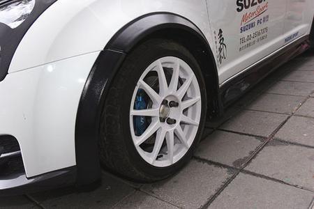 Swift與Mini的經典外型有幾分神似,同樣有高腰線、寬車體、圓弧型車頭與車尾,C柱線也都很寬,后懸身都很短,車頂兩者都是平的,且前緣都帶有弧度;雖然頭燈造型差很多,不過現在改裝「遮掩」技術一流,可輕易克服此問題。欲改成Mini式樣,首先一定要貼上大輪拱的爆龜套件,另一重點在于輪弧要黑色,且與車身不同色,以突顯寬體氣勢才像Mini。此外,車頂也是一重要改裝部分,首先將A、B、C柱黑化處理,貼碳纖維飾條或烤漆都可以,然后車頂一定要烤成白色,車身再搭配其它顏色,頭燈罩盡量以橢圓形呈現,如果車頂、引擎蓋上再貼上一粗一細貼紙修飾更為傳神。