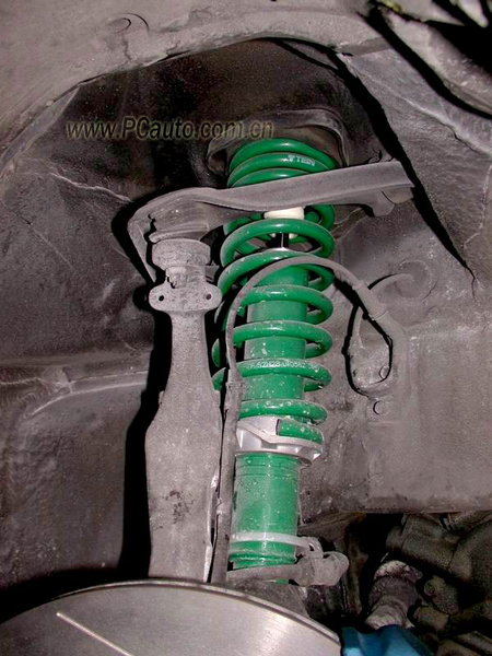 懸掛方面的改裝則更具考究,一般街道上的短彈簧,套裝改裝已經不能提供給車輛在賽場上足夠的支撐力,K數適合的攪牙減震則更適合賽場上的需要,高檔的攪牙減震還有軟硬和各種傾角調節,方便技師因應不同的賽道特點進行調整。