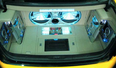 這部車(chē)的系統(tǒng)中,一共使用了四部 Audiobahn 功率擴(kuò)大機(jī),其中兩部功率較大的 A2601Q,分別驅(qū)動(dòng)裝在音箱中的一對(duì) Alum 12Q 鋁合金震膜超低音單體,由于12Q是雙音圈的結(jié)構(gòu),每個(gè)單體的兩個(gè)音圈以并聯(lián)的方式,分別各自接駁到以單聲道橋接模式的 A2601Q 來(lái)驅(qū)動(dòng),此時(shí)的阻抗為兩歐姆,可壓榨出擴(kuò)大機(jī)更大的功率輸出。另外兩部功率擴(kuò)大機(jī),是輸出功率較小的 A2301Q,其中的一部用來(lái)驅(qū)動(dòng)前音場(chǎng)喇叭,采用的是德國(guó) Rainbow 的兩音路喇叭 CS265P,屬于這個(gè)品牌相當(dāng)高等的型號(hào),可見(jiàn)車(chē)主對(duì)于聲音的要求。前音場(chǎng)的高音和低音單體,都安裝在原廠的喇叭位置上,因此由外觀完全看不出改裝過(guò)的模樣。另外一部 A2301Q 擴(kuò)大機(jī),驅(qū)動(dòng)的不是位于后座門(mén)板上的后喇叭,而是驅(qū)動(dòng)一對(duì)安裝于行李箱蓋內(nèi)的 JBL 早期單體,為四吋金屬震膜大型凸盆中高音喇叭,安裝在這里想必一定也是為了對(duì)外播放而設(shè)計(jì)的,因?yàn)檫@個(gè)尾廂蓋內(nèi)兩個(gè)喇叭中間還有螢?zāi)弧?BR>
