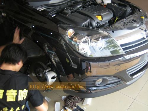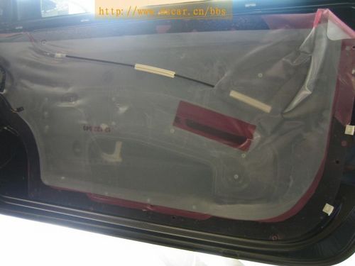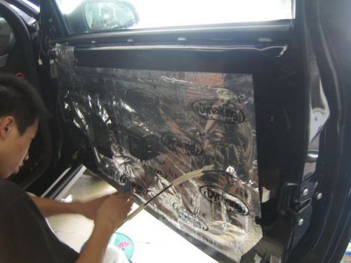 主機(jī):ALPINE經(jīng)典主機(jī)CDM9823 前聲場(chǎng):摩雷兩分頻6.5英寸套裝喇叭都達(dá)瑪度6 低音:美國(guó)專業(yè)低音生產(chǎn)廠家MTX12寸低音單元MTX4512A。 功放:瑞典DLS CLASSIC系列四聲道功放CA41(兩路推前門,兩路橋接后推低音) 為了營(yíng)造安靜的聽音環(huán)境,提升音響效果,改裝音響之前的隔音制震工程是必不可少的。配一包大能頂級(jí)隔音王(散裝包)用于做四門、輪弧、葉子板的隔音。 隔音工程 方案已定,立刻開工!首先是隔音工程,看——為了做輪弧及葉子板的隔音,把車輪都給拆下來(lái)了。 哈哈!道聲的技師真投入,為了把隔音材料貼到位,整個(gè)頭都鉆進(jìn)輪弧里面了。感動(dòng)ing……(看看工作服上標(biāo)語(yǔ):“專業(yè)人?做專業(yè)事”,還真是說(shuō)到做到) 呵呵,施工質(zhì)量高,效率更高啊!轉(zhuǎn)眼間門板的隔音已經(jīng)做好了。仔細(xì)看看,貼得非常踏實(shí)。