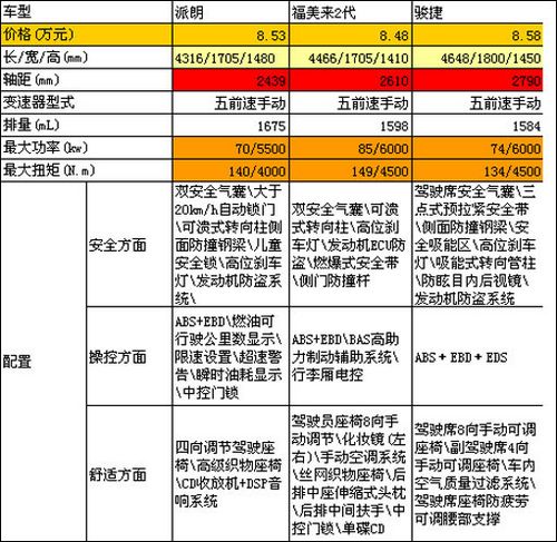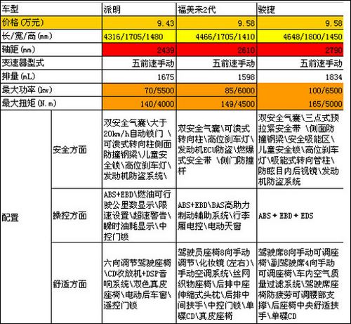 車型平臺和動(dòng)力是派朗不回避的劣勢:派朗與福美來2代和駿捷相比,車身尺寸短了150-232mm,派朗的軸距也明顯偏短。從外觀來看,派朗很難與福美來2代和駿捷的大氣外觀相比。動(dòng)力方面,不管是發(fā)動(dòng)機(jī)的功率還是扭矩,派朗均遜色于福美來2代,但是排量卻比福美來2代大了一些。