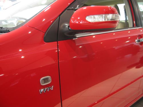 在車身的小型轉向燈下面標明是VVT-I發動機的設計習慣已經在豐田的全球車型上實用。也是豐田值得驕傲的技術之一。同時VVT-I的標致的價值已經上升到與豐田的牛頭標一樣,都值得消費者信賴的標致。后視鏡帶轉向燈給駕駛者及行人充分的安全預警。