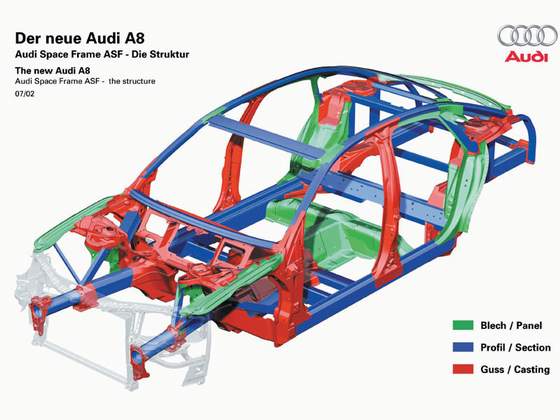 A8 是在 1994 年的日內(nèi)瓦車展上首次亮相的,但他并不是第一個(gè)開始使用鋁質(zhì)車身的車型。早在1985,奧迪就在漢諾威展示了一副全鋁的汽車車身,該車身是在70年代末開始研究的。1985年5月,奧迪公布的一張照片吸引了當(dāng)時(shí)眾多世界媒體的關(guān)注,照片上是兩個(gè)漂亮的女模特舉起一副鋁質(zhì)的汽車車身。