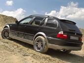 在“適合任何道路任何天氣行駛”這一主題的指導下,專門改裝寶馬車的車廠AC Schnitzer的工程師和技術人員開發了一套全新的底盤和符合動力學的引擎系統,這就是圖片中的這款 X-ROAD。這項復雜的開發工作也是原來的寶馬 3 系 E46 開發的延伸,因為 X-ROAD 有許多的組件與AC Schnitzer改裝的 3 系是通用的。這次的改裝還包括懸掛系統的調校,這樣車身的離地距離提高了30mm,更加符合寶馬 X 系列全地形通過的能力。為了與提升后的懸掛相配合,輪圈與輪胎都進行了相應的調整,輪圈是AC Schnitzer開發的第三代 8.5J×17" ET 43 合金輪圈,輪胎則是 225/55 ZR 17 全地形輪胎。車體也進行了修改,不但是高度增加了30mm,寬度也增加了20mm,為 3 系設計的空氣動力性能經過了適當的調整以適合新的 X-ROAD 車型,前保險桿和后裙腳給該車提供了良好的保護。正如我們所說的一樣,X-ROAD 有許多的組件與AC Schnitzer 是共用的,例如用特種鋼材料制成跑車消聲器和合金的排氣管,懸掛則使用了鋁質材料。在車的內部方面,也采用了大量的鋁質材料、碳纖維和皮革的座椅等等,另外還裝備了特殊的語音導航系統和多功能顯示屏,目的是解決任何在行駛過程中可能發生的問題。