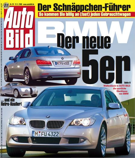 最新的一期德國雜志AutoBild封面引起了我們所有人的注意,因為上面是新小改款的寶馬5系(假想圖的機會很大),雜志里面的詳細報告我們還沒有看到。寶馬5系最近的一次換代是在2004年,那2009年寶馬的全新5系也就很符合邏輯,這也將預示著全新5系會在前一年(2008年)發布。雜志封面的車型明顯只是小改,因此距離我們看到他真面目的時間更近。