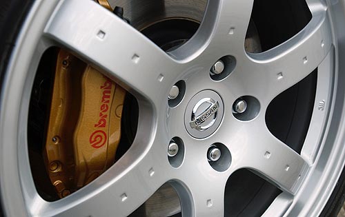 350Z的懸掛是全獨立式的,前后懸掛都是多連桿式的,懸掛都采用鋁來制造,目的式為了進一步減輕車重。為了加強制動效果,350Z配備了ABS和EBD以及通風盤式剎車碟,這些又大又厚的剎車碟通過大尺寸的卡鉗來牢牢鉗緊。在某些車型上(比如Track)還裝備了VDC穩(wěn)定控制系統(tǒng)。