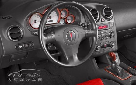 車子的外觀改進包括前置面蓋部分的重新設計,內嵌式的進風口位置設計得更加低,鉻制處理的標志性旁蒂克前臉更具侵略性,引擎蓋上面開出了兩個氣孔。至于車身的背影,雙鉻制的排氣裝置以及獨一無二的“錘頭”式都讓回頭率增加不少,19英寸的輪轂,穿孔的碟剎以及比以前位置低上25毫米的懸掛都讓這款GXP顯得運動性大增。車子的內部以紅色為輔助色調,讓GXP看起來比標準的G6運動性更強一些。