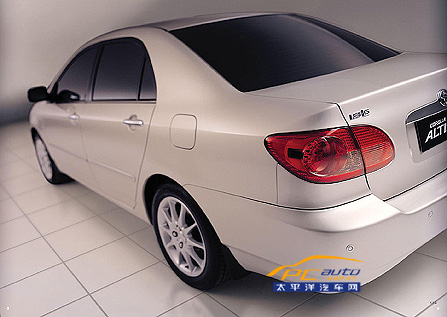 一眼看上去,以2004款名號推出的全新小改款的Toyota Corolla Altis,與現有的車型并沒有什么不同。而此款全新年式的Altis在鈑件上,的確與舊車款同出一轍,沒有做出什么變動。其最大的改變,就是在前燈方面的修改。其全新設計的橫向鍍鉻水箱護罩,搭配全新立體四圓燈式晶鉆頭燈及流線前保桿,完成了精致的車身構面,與原本傳統Toyota的直瀑式造型相比,其車頭造型更顯動感之勢,更具速度感。而HID氣體放電式頭燈則大大加大了其照明的亮度,而此HID頭燈的向前照射水平角度也可進行手動調節。 其強調高辨識性的全新晶鉆尾燈等設計,使駕駛時候,前方的視野更加明亮清晰,既增強了駕駛安全性能,又散發出年輕感及科技感。不可不提的,就是Altis裝備了16吋鋁圈,這也是率先在同級車中出現的,令此款轎車更具豪華感。
