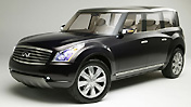 無限的車標位于散熱格柵的正中位置,獨特的造型仿佛給QX56的“鼻子”加上了“鼻孔”,致使整個車頭令我們聯想到了動畫片“貓和老鼠”里的大狗,霸道兇狠展露無遺。QX56擁有魁梧強壯的身軀,給人充滿了著力量的感覺。其外形設計,依舊延續了系列無限車型的感覺:無限標志性的“瀑布式”的水箱格柵、緊繃的桶形的側面、沉穩的前照燈等等,依舊的擁有無限力量的感覺。 QX56采用的也是18英寸合金輪轂,不過輪胎比領航員要寬10mm。超大的門把手,使人不是很容易握住。QX56的尾部也是方方正正的設計,棱角分明,向側面排氣的粗大排氣管比較惹人注意。