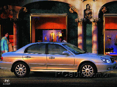 第一眼看去,索納塔張揚的外表極具視覺沖擊力,直接的感覺就是其腰線的節奏,其靠近車燈線條的弱化和下彎,以及順線向車中間的移動,可以感受到一種淡雅的情致。車身后部采用了邊緣平滑的行李箱蓋和雅致的后燈,還采用了沿腰線、側梁和保險杠的一體化鑲條,而車身的頂部卻趨于平穩,這種不追求弧線的強過渡與車體的完整配合,更給整車構筑了一體的靈韻和動感,并隱約閃現著豪華轎車的古典風范。索納塔車前燈的設計十分新穎,兩個前大燈巧妙結合構成的動感,和車前部的線條相互呼應。由于采用了平滑的行李箱蓋以及雅致的后燈,整車從后部看去同樣能夠體現外形設計的靈動。