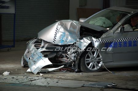 當天下午,一輛裝有兩個碰撞假人和多種測試儀器的國產豐田銳志轎車,停放在牽引索道的盡頭。現場一切準備就緒后,這輛銳志便以目前國內公開測試中,車輛所達到的最快速度(64km/h),以正面偏置碰撞的方式撞向固定物體(車頭撞擊面約50%)。巨響之后,沖擊力使銳志退后數米,并向右后方轉動了約45度。受到撞擊的銳志車頭左側嚴重變形,不過發動機并未后移,而是下沉至發動機艙的底部。在現場觀察中看到,這輛銳志的頂部(天窗后部位置)發生輕微折皺,且左側A柱出現凹陷,不過A柱本身沒有彎曲。車門在碰撞過程中始終處于關閉狀態,撞擊后工作人員很容易將其打開。總的來說,在碰撞結束后,駕駛員一側的車頭內移,但沒有對駕駛倉造成沖擊,車內駕駛員的腳部地板也沒有發生內凸現象,車身整體結構形狀保持完整,駕駛員及副駕駛員均擁有足夠的逃生空間。從這輛銳志的這些撞擊后的特征看,這款銳志車達到了安全設計要求,能夠在被動安全上對駕乘著提供的保護。至于假人的具體測定值是多少?沖擊力實際會假人造成多大傷害?還需要等待日后技術人員給出答案。