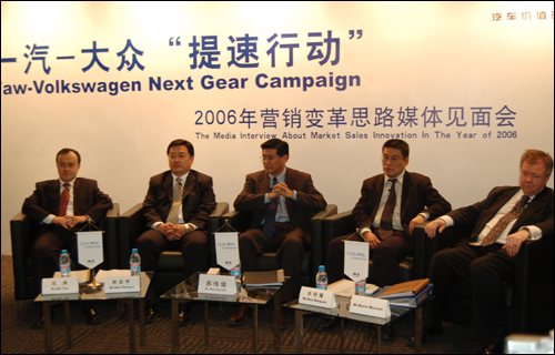 PCauto北京訊:3月8日晚上,在一汽大眾新任商務副總、一汽大眾銷售有限公司總經理蘇偉銘先生的主持下,一汽大眾在北京舉行了一汽大眾“提速行動”2006年營銷變革媒體交流會。會上,各大媒體對一汽大眾管理層進行了采訪。