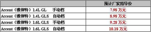 據太平洋汽車網了解,北京現代第一款經濟型車雅紳特即將于3月16日上市。這款備受大家關注的車當前最令人關注的無外乎是它的上市價格,而北京現代卻遲遲不肯透露,為其上市造足了聲勢。但是可以根據以下三個方面還是能夠大致預計出此次國產Accent雅紳特廠家指導價: 第一點:北京現代今年首款新車型Accent雅紳特,與去年現代汽車在北美市場投放06款Accent是同款車型。據悉,這款轎車(Accent)在北美地區只有GLS一種型號,但是可選擇價值800美元(約人民幣6460元)的升級套裝如地毯等以下是2006款Accent在北美地區的相關車型及報價: 1.6排量的Accent,在北京和北美兩個地區雖然都搭載的是1.6升發動機,但是在北美地區現代汽車售后服務可以說是十分完善,提供了5年/6萬英里包修、10年/10萬英里保修、5年/無里程限制的拖車援助的售后服務,而且配置也相當高:Accent GLS的標準配置包括帶有ABS、EBD系統的四輪碟式剎車,前排正面、側面雙安全氣囊及氣簾,功率172瓦的帶AM/FM/CD的6喇叭揚聲器系統等。考慮到國內的售后服務會和配置都會大大折扣,所以價格會相應的降低。 第二點:都是經濟型轎車的東風標致206,作為剛上市的新車型可謂銷量非常好,定單踴躍。標致206共有四款車型,售價分別在8.68萬—10.88萬元之間。此車型全部配備了1.6升發動機,只是在配置和變速箱上有差距。這樣的價格給北京現代雅紳特的定價帶來了壓力。 (東風標致206自動變速箱使用的具有保時捷技術的“Tiptronic” 4速手自一體變速箱,而雅伸特只是使用普通的四速自動變速箱。) 第三點:因為北京版Accent是目前市場上銷售的東風悅達起亞新千里馬的升級車型。新千里馬1.3排量和1. 6排量最高售價分別為7.98萬和9.88萬。所以雅紳特定價應該略高于新千里馬的價格。 現代雅紳特1.6AT GLS (點擊查看)和1.6MT GLS(點擊查看)的詳細參數及配置太平洋汽車網早有報道,下面是現代Accent(雅紳特)1.4 GL MT和1.4 GLS AT詳細參數及配置單: |