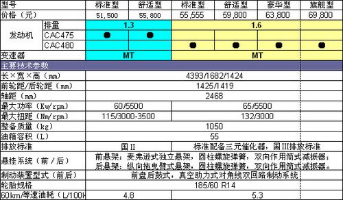 表為奇瑞-旗云1.3L與1.6L主要參數對比 旗云1.3L除了繼承了旗云1.6L的外型和技術性能,仍然具備了旗云更實用、更省油、更安全、更流行、更皮實的賣點特征。在旗云1.6L所具有的低油耗基礎上,旗云1.3L再創新低,百公里油耗僅4.8L。旗云1.3L雖然排量降低,但動力性上是不用擔心的,60KW/5500rpm及115Nm/3000rpm的馬力和扭力輸出一定會有令消費者滿意的表現。從綜合優勢來看,旗云1.3L上市后,目前主打小排量經濟型車市場的夏利1.3L,羚羊1.3L千里馬1.3L以及富康1.4L等車型將面臨前所未有的競爭壓力。