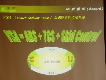 PCauto現場報道:06款雅閣今天下線,關于06款雅閣的價格會在晚上公布。在活動現場,我們PCauto現場記者切身體驗了06款雅閣的動力和安全性能,在此將06款雅閣的安全變化系數做一詳細講解: 安全性方面——增加了獨有的VSA系統 主動安全性方面,為了提高操控的穩定性和行駛的安全性,06款雅閣在2.4L和3.0V6版本上采取了全新的VSA系統-車輛穩定系統。可以用一個公式來說明下:VSA=ABS+TCS+SKD Control,該系統不但包括了傳統的ABS和TCS功能,還增加了防滑控制,VSA系統工作原理是通過橫向加速度傳感器來進行比較控制,當車輛出現過度轉向和轉向不足的情況出現時候,系統自動啟動,控制車輪的運轉情況,避免危險的出現,使車輛在正常范圍內行駛。
