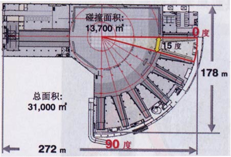 此圖是本田公司的室內(nèi)撞擊測試場地示意圖。在這里可以進行全方位的撞擊測試,包括正面、側(cè)面及后部碰撞。碰撞角度從0-90度,間隔夾角15度。正面偏置從全正面(100%)-10%:撞擊速度從80km/h-0。