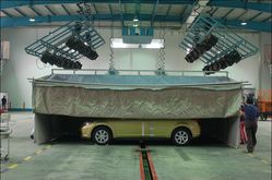 為了保證假人在移出進入車輛后同樣保持較小的溫差,在試驗前車輛同樣需要“享受空調(diào)”。車輛停放的封閉空間內(nèi)溫度控制在18-26度即可。下圖為試驗開始前夕,被測試車輛慢慢從保溫室內(nèi)推出。