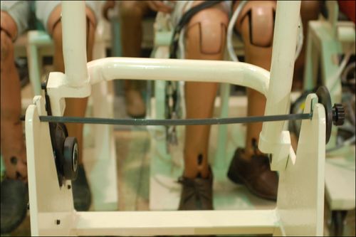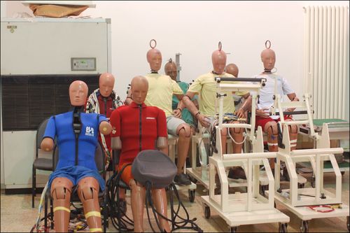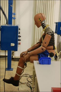 假人的放置同樣很重要,據(jù)技術(shù)人員介紹,為了保證假人不產(chǎn)生變形,為其安排的座椅也是特制的。在這個座椅上,通過一根從假人臀部穿過的鋼管來對其進行固定,而其他任何肢體部分,均不與座椅接觸(如下圖)。