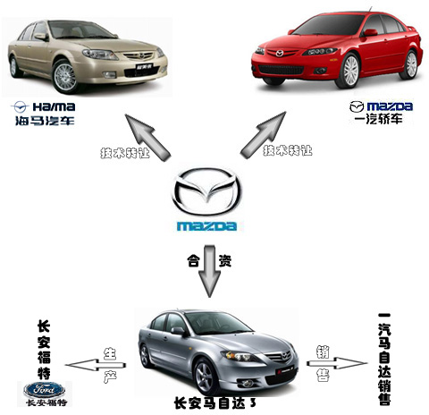 然而,技術轉讓方式對于外方來說,也有著諸多不利因素。首先是獲利途徑太窄。眼看本田和通用等企業在中國瘋狂盈利,馬自達沒有理由不著急。其次是話語權太弱。對于技術轉讓的國產車型,馬自達并沒有什么控制權。Mazda6車尾所標示的是“一汽轎車”,并無馬自達中文字樣,即便是與一汽合資成立的一汽馬自達汽車銷售公司,也是一汽占有絕對優勢的75%,馬自達只占25%;而福美來等車型尾部所標示的“海南馬自達”,也只是空有其名,從來就不存在“海南馬自達”這樣一家合資公司,事實上,福美來和普力馬的品牌所有權均屬于一汽海馬,而非馬自達所有。因此,當在其他合資企業中,外方總是占據多數話語權之時,馬自達卻難以控制旗下產品在中國的發展。