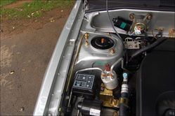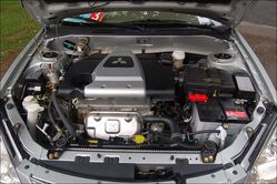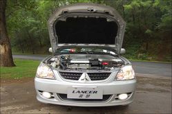 打開藍瑟的發動機艙蓋,整個蓋子十分厚重,甚至讓你在單手托起時感到費力。而那個發動機艙蓋支架則顯得過于單薄。由于外形變化的需要,發動機艙兩側向內收緊,左側的玻璃水箱和右側的電瓶相應內移。整個艙內最惹眼的還屬印有三菱LOGO的發動機罩,由此帶來的整體感和視覺沖擊不言而喻。