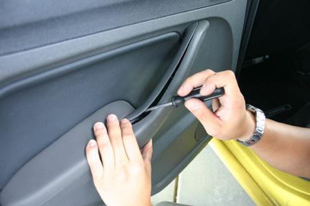 將一字起子伸入拉柄飾板上端撬開,再稍加往外扳開便能順利取下。