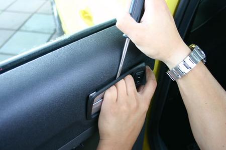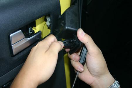 取下飾板后便可以將電動窗插頭拔開,插頭上有個小卡榫要稍微壓下,才能順利拔開。