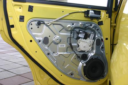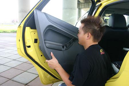 拆下門板便能看見后門板的真實面貌。圖中可以清楚看見Focus采用歐洲車慣用的整片鋼板封死設計,而非國產車常見的薄薄塑膠布遮蔽,難怪Focus在鋼性上及隔音寧靜度都比一般國產車要來的好些。