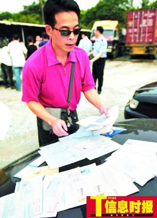 昨日下午,記者接獲線索,又一宗套牌車落網,開車者竟還敢兩次提供假資料給辦案民警,于是記者馬上趕往廣州交警支隊高速一大隊的違法車輛停車場。真車主徐先生一來到該停車場,就忙著將厚厚一疊交通違法通知單攤在套牌車車前蓋上。徐先生很氣憤地說:“這可惡的套牌車,從去年2月到現在,給我弄了這20多張‘牛肉干’,總共40多項交通違法記錄!”