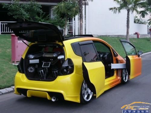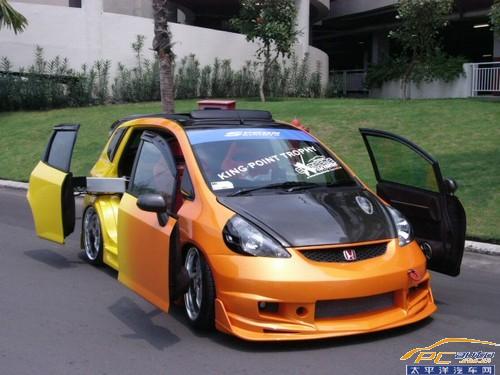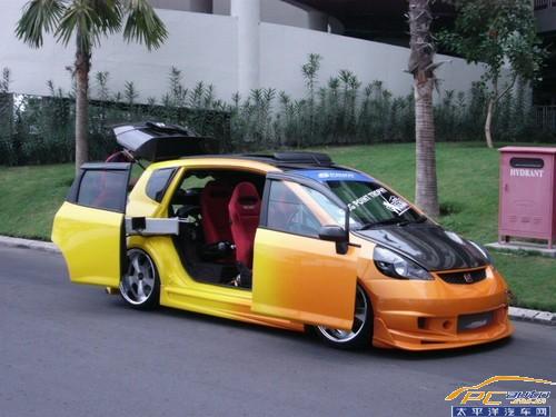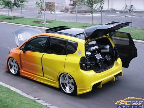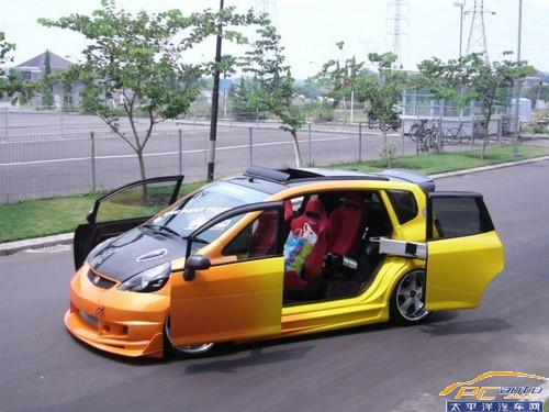 仔細看看,這臺基本上除了依靠前臉可以認定這是一臺兩廂FIT之外,其余都遭到了車主的“殘忍虐待”,被爆改的有點奇形怪狀。特別是兩側別具一格的車門的改動,酷到極點!讓筆者想起了小時候追看的動畫片《變形金剛》。