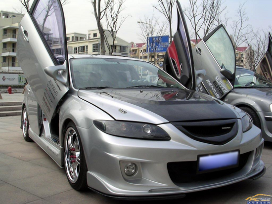 該馬自達(dá)6改裝了大包圍、發(fā)動(dòng)機(jī)蓋、車燈、輪圈等部位,其中剪刀車門更為點(diǎn)精之作