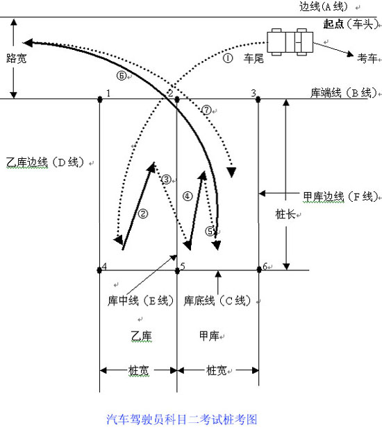 詳見下一頁詳細圖片 二、尺寸 。ㄒ唬堕L為二倍車長。前驅動車,加50厘米; 。ǘ秾挘捍笮蛙嚍檐噷捈70厘米;小型車為車寬加60厘米; 。ㄈ┞穼挒檐囬L的一點五倍。 三、操作要求: 從起點倒入乙庫停止,再二進二退移位到甲庫停正,前進穿過乙庫至路上,倒車通過甲庫出庫。 四、考試合格標準。 未出現下列情況之一: 1、不按規定路線、順序行駛; 2、碰擦樁桿; 3、車身出線; 4、移庫不入; 5、中途停車兩次; 6、中途熄火; 7、停車后使車輪轉動; 8、頭、手伸出車身外或打開車門探視。 五、有關說明 1、在考試過程中,考車的行駛軌跡必須按① → ② → ③ → ④ → ⑤ → ⑥ → ⑦這7個軌跡順序行駛,其中每個軌跡都是單向倒車或前進。 2、車身出線:在考試過程中考車的任何部分都不能越過A線、C線、D線、F線。 3、車輛在完成①、⑤、⑦步驟停止時,車身任何部位垂直投影不得壓、超庫位線B、C、D、E、F。 4、考試期間除按規定線路行駛需改變車行方向(由倒車改前行或反之)而停車外,其余停車為違規停車。 5、考試合格標準第7條是指不得在車輛停止時打方向盤。 6、樁桿垂直立于樁位1、2、3、4、5、6,所有樁桿等高且比車身高50cm。 汽車駕駛員科目二考試樁考圖