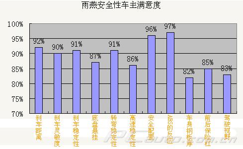 點評:此次參與調查的雨燕車主共有125位,其中13位車主表示自己的車曾經遇到過安全事故,占總體車主的10%。車主們對雨燕最滿意的還是其安全配置。其次則是對其剎車性能和穩定性也予以較高的評價。看來身負賽車血統的雨燕在操控安全上還是讓車主放心的。