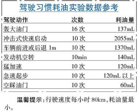 也許,您是一名駕駛方面的新手,一定非常想知道怎樣開車才能省油;也許,您駕車已有幾年的歷史,擁有一定的經驗,但近期居然發現愛車的耗油量忽然上升了。良好的駕駛習慣對油耗控制有著直接的影響,下面就看看駕駛習慣對油耗的影響度吧。(數據來源:北京娛樂信報)