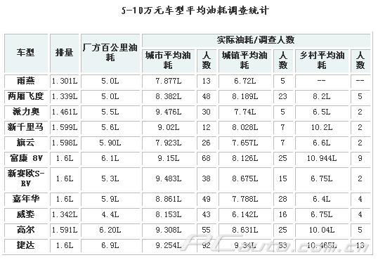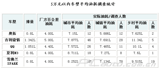 近段時間來,油價不斷攀升,上半年來油價已經經歷五次調整,屢創新高。一提起油價,司機車主們就心驚肉跳的。更有可靠消息說,國內油價漲幅還不夠,未來還會繼續上漲。一時間,有車的人不敢多開車了,沒車的人不敢再買車了,只有那些開著不是自己的車,油錢不用自己掏的人還是一幅無所謂的態度。雖說以前可能不覺得油耗是什么大問題,但是看眼下這個發展情況,既然油價的上漲是不可逆轉的趨勢,那么想要節省開支,只能從愛車的油耗入手了。這次,小編特意精選了市場上30款熱門車型進行一次油耗大調查。這30款車型幾乎覆蓋了從5萬元到15萬元區間,車主們最為關心的、購買率最高的所有車型。我們將這些車型分成三組,分別是5萬元以內、5-10萬元之間、以及10-15萬元之間三組,由于路況的不同會對油耗有所影響,我們分別調查城市行駛油耗、城鎮行駛油耗和鄉村行駛油耗。讓還在為油耗而頭痛的準車主們可以按照適合自己的價格區間來比較車型的油耗,同時讓老車主們可以好好研究自己的愛車的油耗相比起來是高還是低,完完全全了解實際油耗。需要說明的是,由于是按照價位來分組,因此同一組中的各車型在排量上會有所不同,因此調查出來的油耗高低并不能直接用來比較說明問題,只是供車主們參考。