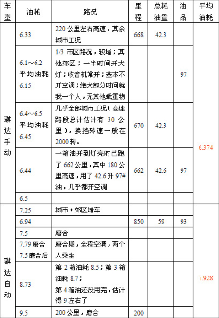 騏達(dá)上市已經(jīng)有兩個多月的時間了,關(guān)于騏達(dá)在實(shí)際使用中的油耗,是騏達(dá)的車主和想購車的消費(fèi)者比較關(guān)注的問題。筆者依據(jù)網(wǎng)友關(guān)于騏達(dá)油耗的帖子,總結(jié)了騏達(dá)的平均實(shí)際油耗,見下表: