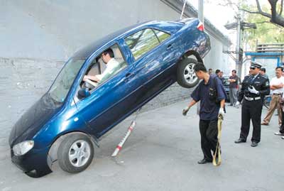 昨天中午11時(shí)30分左右,一輛嶄新的藍(lán)色威馳車,因倒車時(shí)未注意到后方電線桿,且油門較大,倒著爬到了電線桿拉線4米高處,后經(jīng)救援安全落地。 昨天下午1時(shí),在鼓樓西大街的電線桿拉線上趴著一輛藍(lán)色車號(hào)為京FT3126的威馳車。只見這輛車懸在4米高的半空,與地面傾斜成45度角,而且車前保險(xiǎn)杠啃在地面上,車尾卡在電線桿拉線上,除車的前左輪著地外,其余三個(gè)車輪均脫離地面。車旁邊身穿黃色上衣,戴著眼鏡的司機(jī)王先生,不停地搓著雙手。
