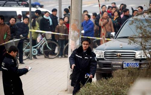 1月9日15時10分,一輛渭南牌號的越野車在西安市東二環咸寧路立交橋下倒車時撞死2人,重傷3人。其中,一家三口同遭車禍,妻子死亡孩子受傷。事發后司機棄車逃逸,圍觀群眾紛紛譴責逃逸司機。 越野車連撞6人 15時40分記者趕到事發現場時,西安市交警七大隊民警正在現場進行勘察。只見車牌號為陜E00965的墨綠色豐田越野車停在金花南路109號右側拐彎處人行道的綠化帶里,在車前4米處有一攤血,十幾米外躺著一具尸體,旁邊放著一個書包,頭部血跡一直流到2米外的人行道下。據了解,死者系附近一中學的高中生。