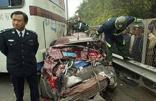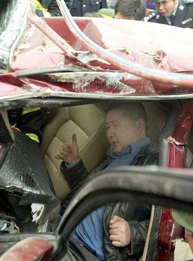 一輛車廂加密封蓋的貨車從坡頂下行,往人和方向。見前方車行緩慢,貨車駕駛員立即剎車,車身仍快速順坡疾駛,車頭撞上一帕薩特牌轎車車尾。轉(zhuǎn)瞬,公路中響起車胎摩擦路面、防撞護欄被擦掛的刺耳聲。此聲還未消失,更刺耳的響聲再起——貨車抵著轎車,追尾撞上前方一大客車。被撞客車滑行10余米后,橫在路中;轎車頭鉆進客車車尾,車尾則被貨車車頭撞得縮成一團。變形轎車中,駕駛員被牢牢卡住,生死不明。