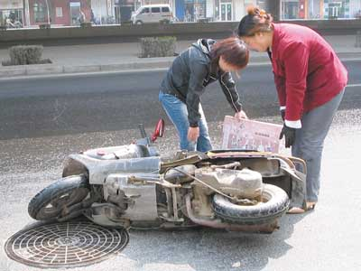 在北京豐臺區西四環南路區委橋處,300米長的馬路有一大片油。20分鐘內,路經此地的12輛摩托車全部摔倒,兩車追尾。