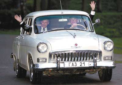這是雙方會晤后,布什試駕普京的1956年款伏爾加汽車在晚宴前“兜風”。