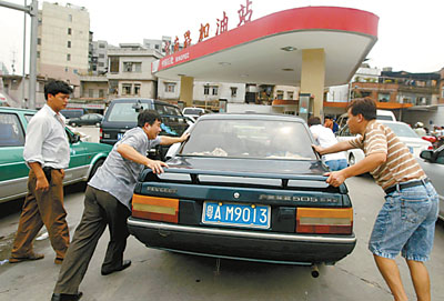 在寶崗路一加油站,幾個(gè)壯漢推著耗盡燃料的車來(lái)加油。