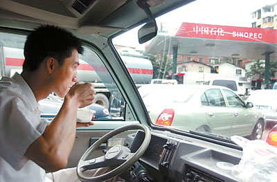 等上好幾個(gè)鐘頭也未必有油加。寶崗路一加油站,等待的人們一臉無(wú)奈。