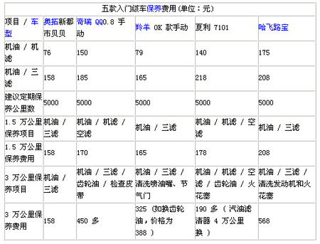1.5萬公里保養:這一項5款車的費用差別也不是很大,哈飛路寶最高,奧拓新都市貝貝最低。