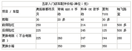 1、本次調查的5款入門級車型:奧拓新都市貝貝、奇瑞QQ0.8手動、羚羊OK款手動、夏利7101、哈飛路寶。