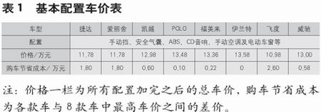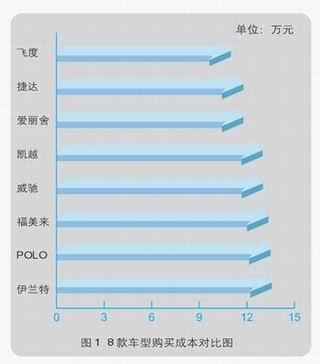 車輛購買成本對比 車主在接觸到車的第一部分花費必然是買車的成本,而且這一部分的花費是一次性支出,價值也是最大的,往往被車主們看成是最重要的購車因素,所以我們首先就來計算這部分成本。由于我們選擇的8款車型的品牌及配置各不相同,我們只能拋開品牌因素,并且人為地規定車型的配置,即所有車型都要擁有大致相同的基本配置,這樣才能具有可比性。8款車型需要的基本配置包括:手動擋、安全氣囊、ABS、CD音響、手動空調及電動車窗等。詳細購買價格參見表1,并配有柱狀圖解圖1(數據來自廠家銷售熱線)。