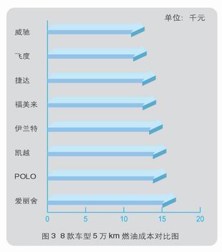 其實(shí)只有燃油費(fèi)用才是伴隨車輛使用全過(guò)程的,這部分成本應(yīng)該是最多的,也是最重要的,能不能節(jié)約成本從燃油消耗上最能夠直接體現(xiàn)出來(lái)。雖然每百公里的耗油量相差只是1~2 L,但是長(zhǎng)此以往,積累到5萬(wàn)km時(shí),也就不是一個(gè)小數(shù)目了。這也應(yīng)該是除了車價(jià)外,車主們最為關(guān)心的。我們通過(guò)各個(gè)車型車主們的采訪,采集到了一部分燃油消耗數(shù)據(jù),詳細(xì)情況參見(jiàn)表3,并配有柱狀圖解圖3(數(shù)據(jù)來(lái)自部分車主實(shí)際用車統(tǒng)計(jì)結(jié)果,僅供參考)。 評(píng)論