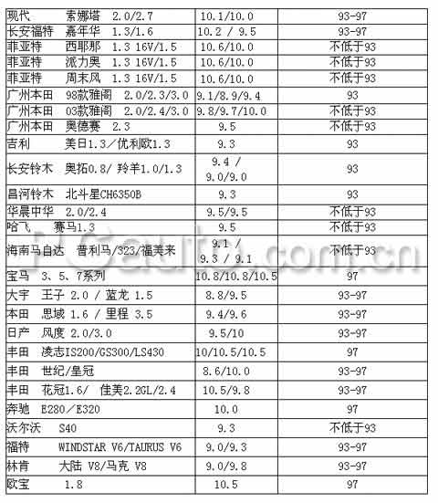 國內外汽油轎車用油標號推薦